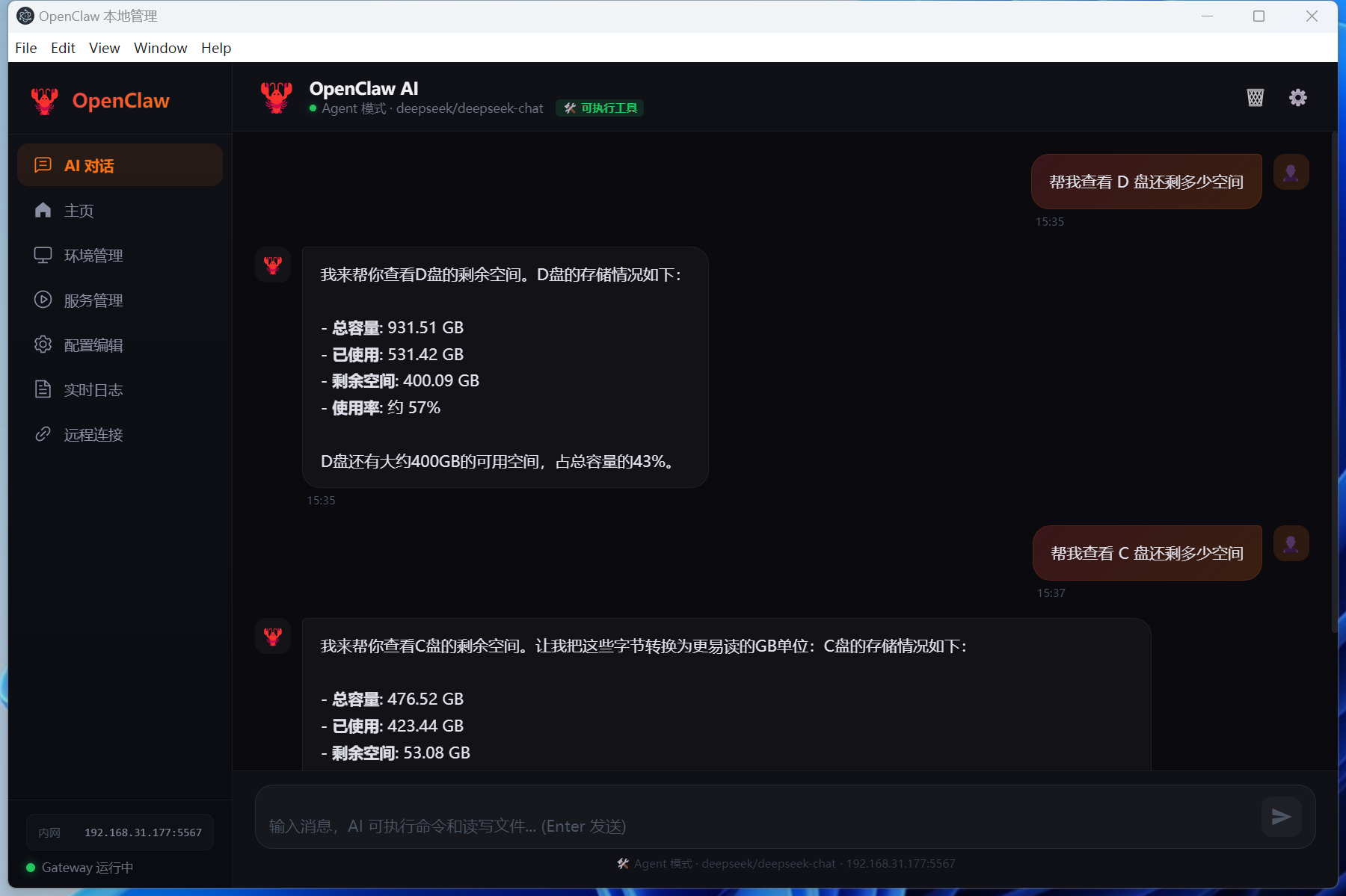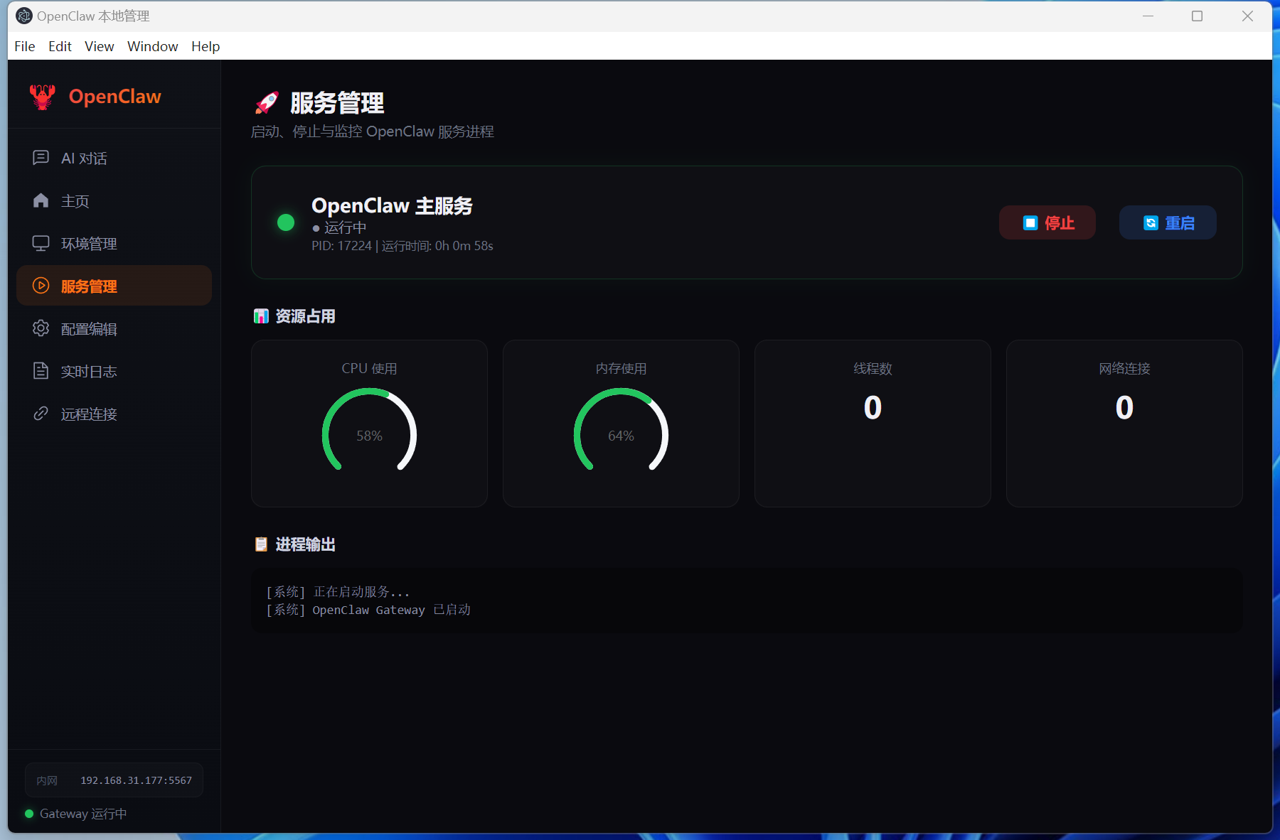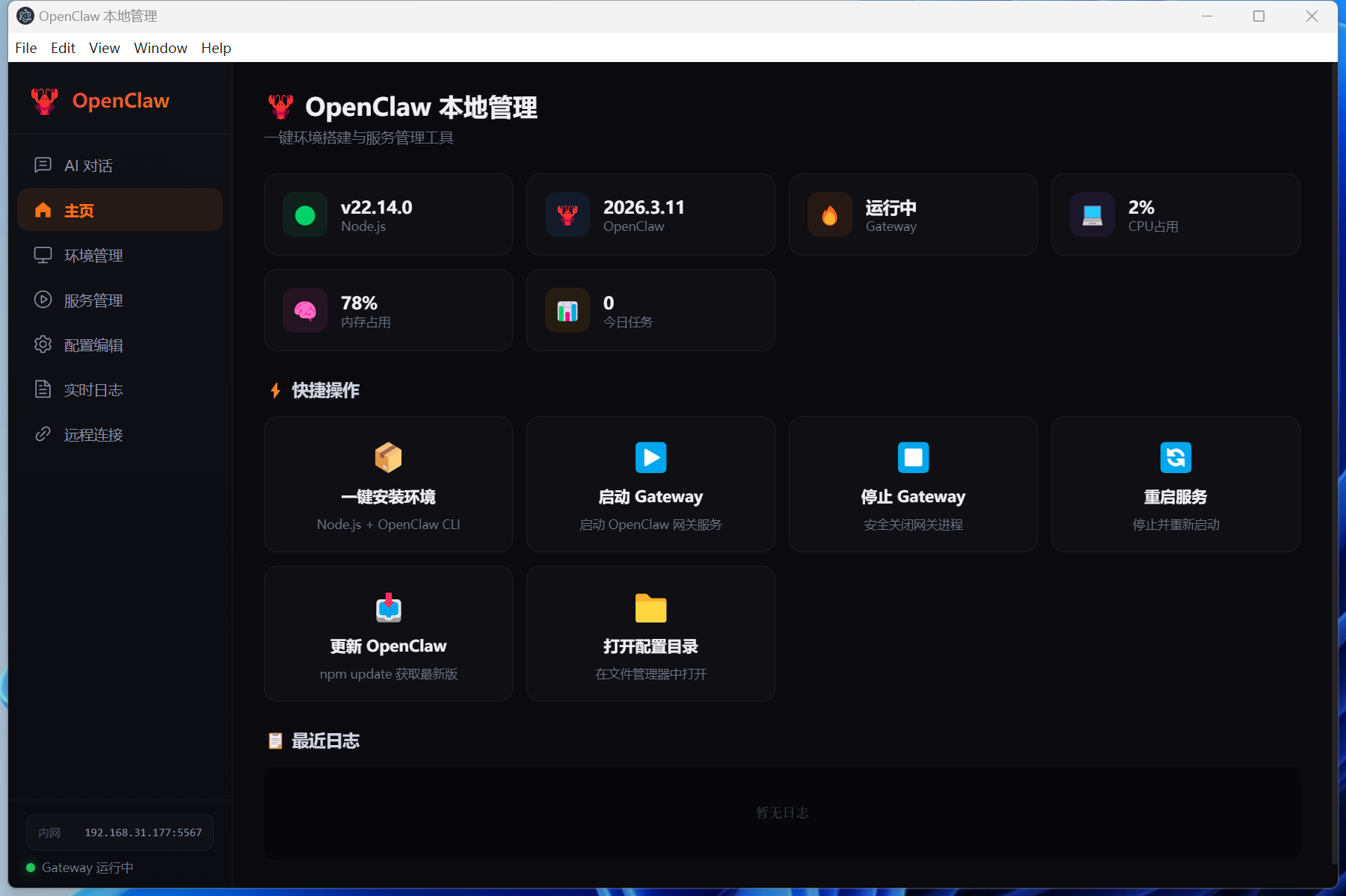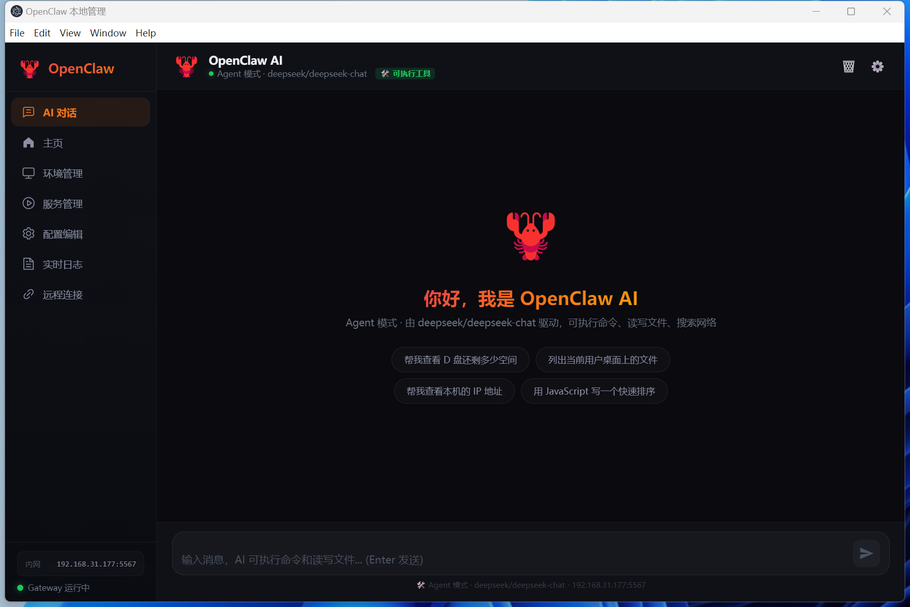5. 进入 **服务管理** 启动 Gateway,或直接在 **AI 对话** 中与 AI 交互