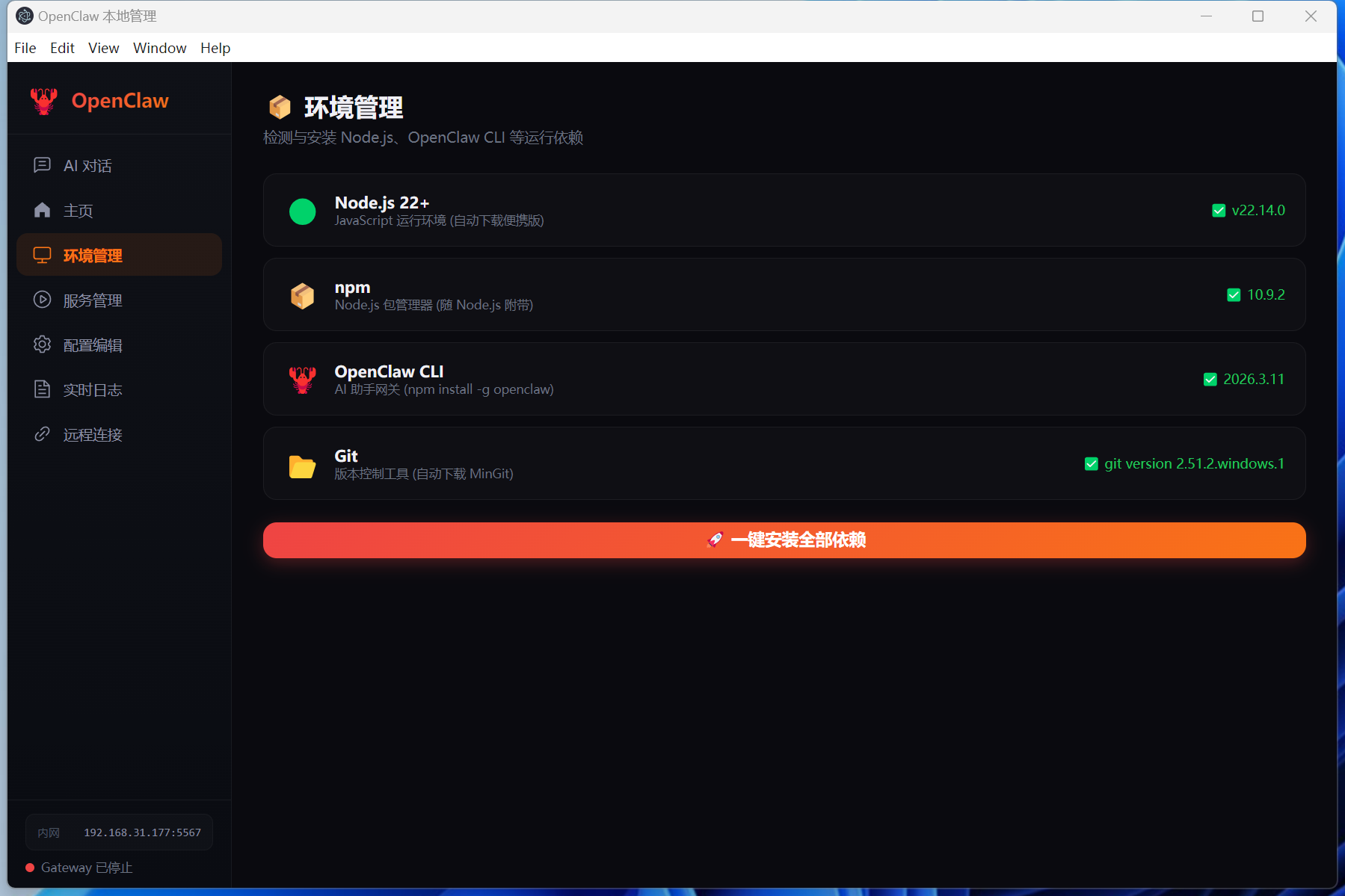安装后打开应用,进入 **环境管理**,点击 **一键安装全部依赖**,即可自动下载 Node.js 22 和 OpenClaw CLI。