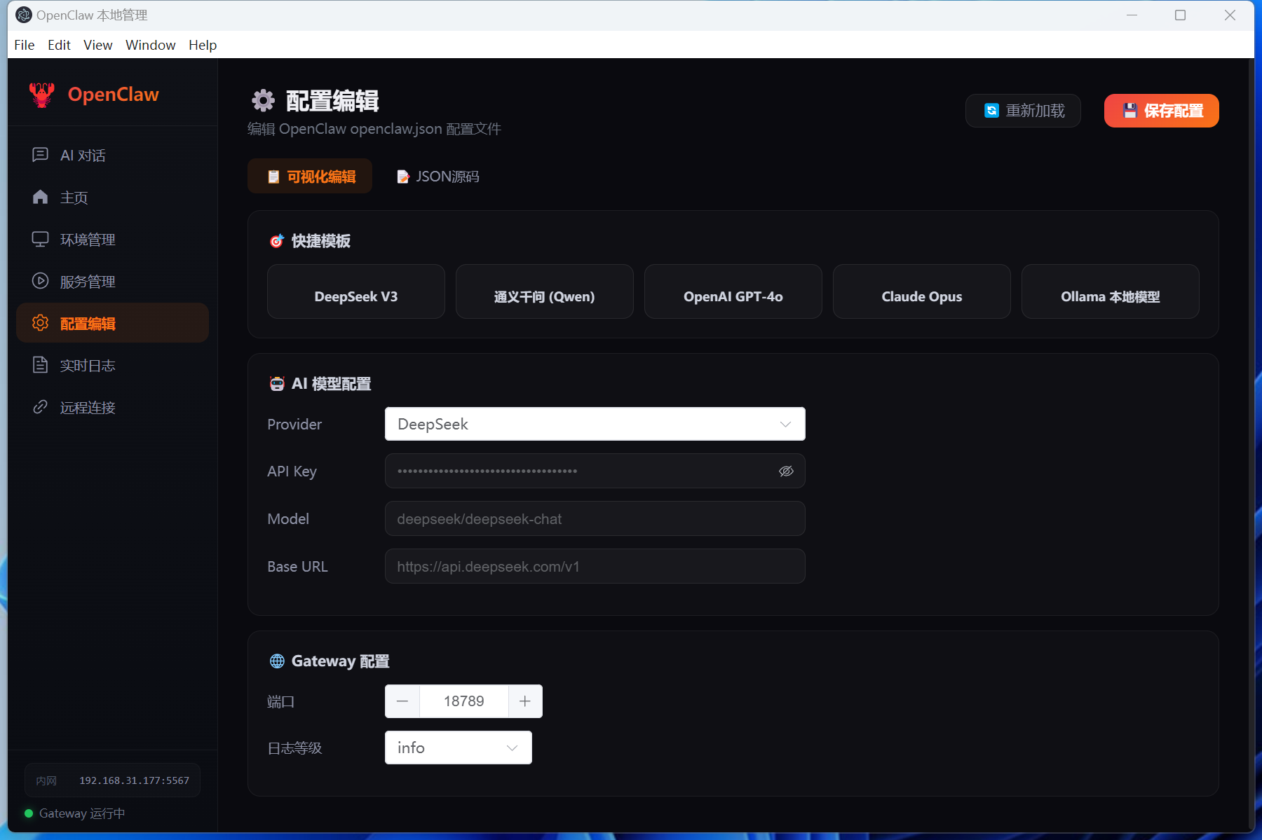 - ▶️ **Gateway 管理**:启动/停止/重启/日志查看