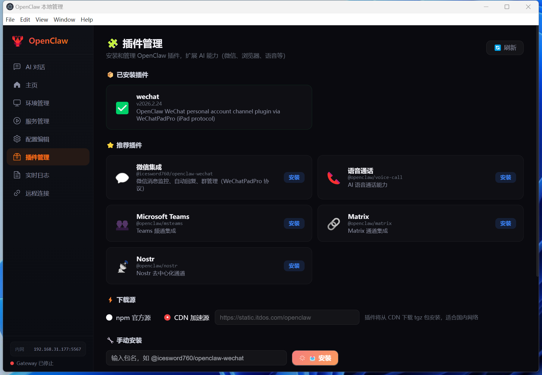 | **手动安装** | 输入 npm 包名,点击「安装」(如 `@icesword760/openclaw-wechat`) |